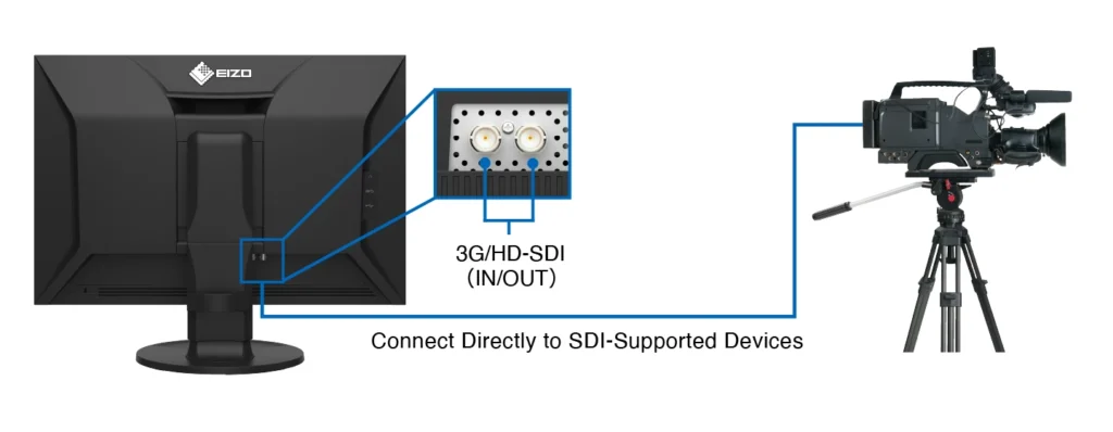 The CG2400SV features SDI input and output terminals, supporting 3G-SDI Level A and HD-SDI signals. SDI connectivity enables the transmission of uncompressed video signals, preserving the full fidelity of HDR content without introducing visual artifacts. This ensures seamless integration with professional camera systems and live video feeds, making the monitor a reliable solution for accurate monitoring on-site and in-studio.